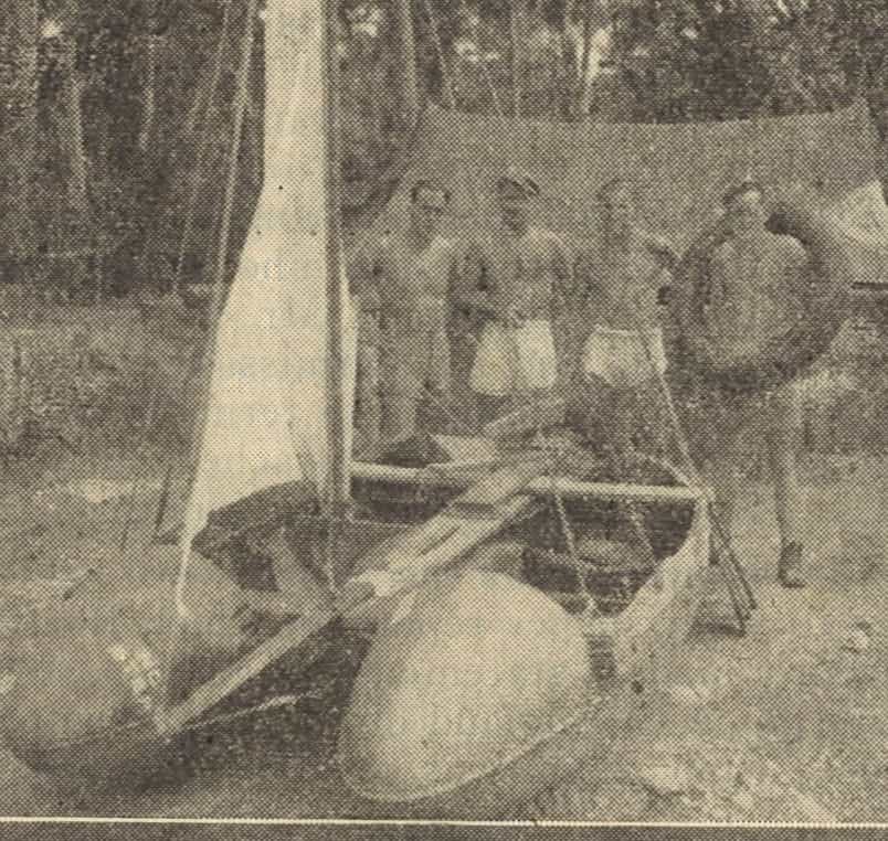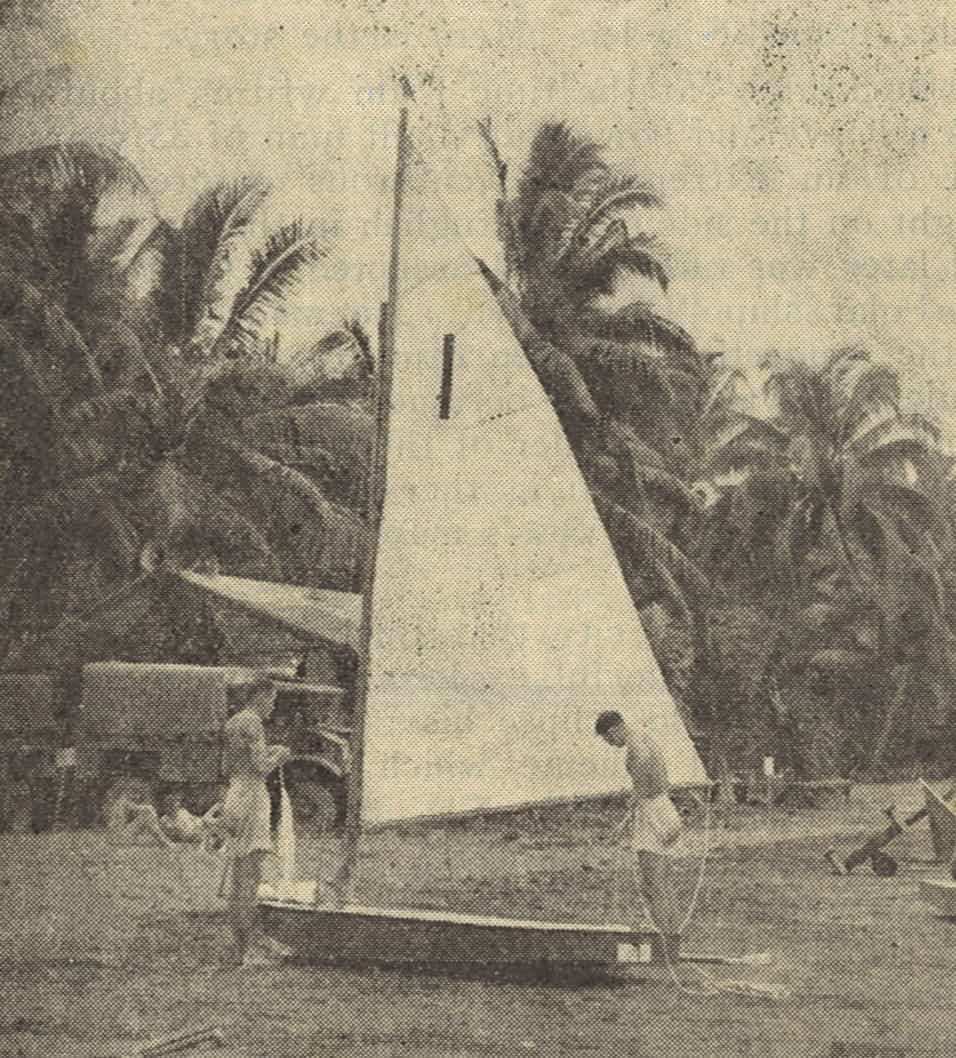 The so-called “Santo” class boat we built was 10ft. by 4.ft. 6in., flat-bottomed and fast. We carried a 19ft. stick and a total sail area of approximately 120 square feet, which is considerable for a boat of that size, and possible only because wind velocities seldom reached any height. The few occasions when the wind did start to blow resulted in several capsizes, and I can remember the day when our ship was planning with all wires humming. Oh yes, life was worth living, even in the islands.