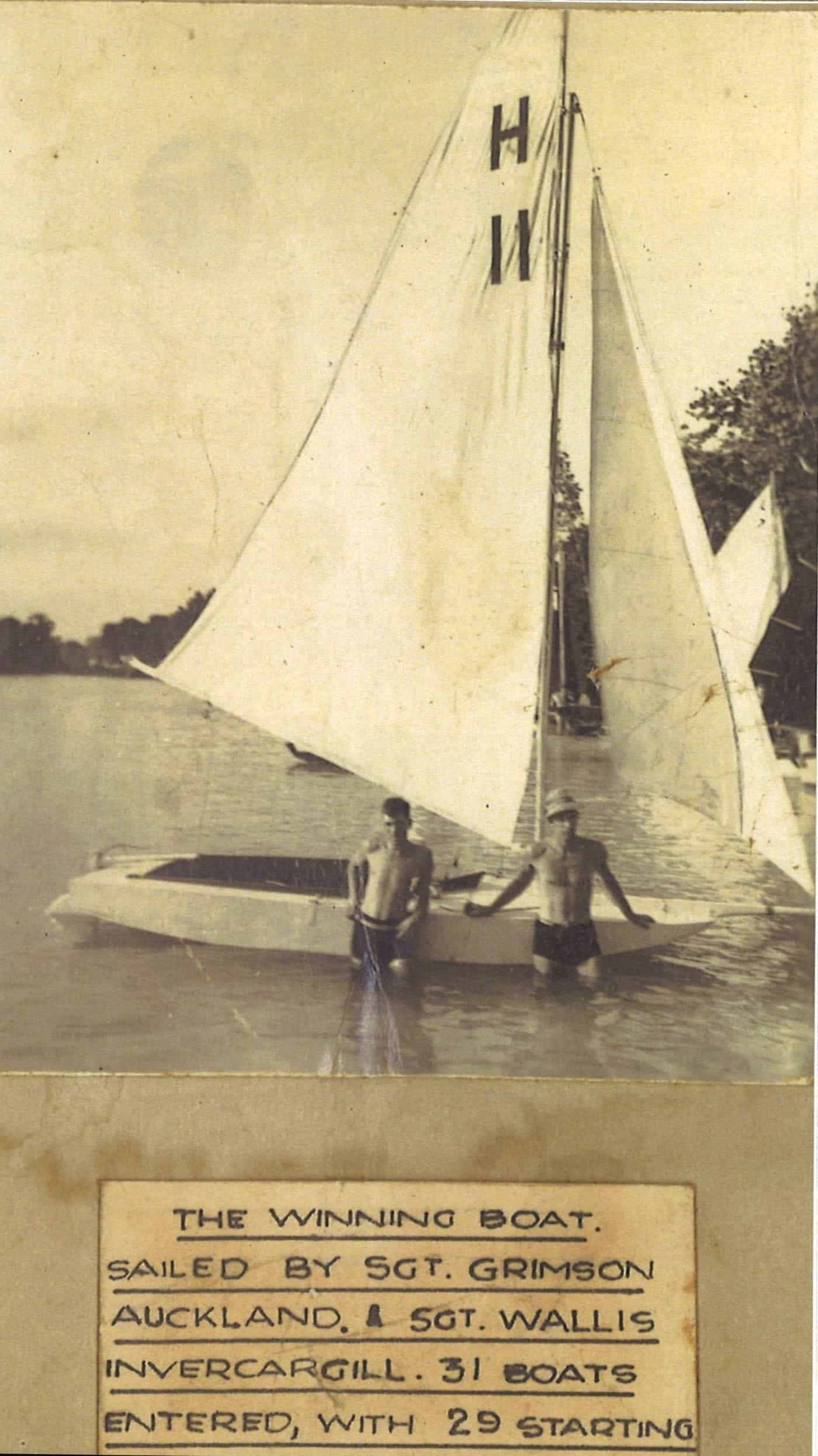 When two boats had been built, we organised an opening regatta, with prizes for the first three boats presented by Sir Robert Clark-Hall. Palm leaf-decorated tables laden with cake and fancies came from the Y.M.C.A. A tote, with win and place betting, and a loudspeaker commentary all made for a festive occasion. The official photographer in the R.N.Z.A.F. turned up and did us proud with frontpage publicity in the “Free Lance” several weeks later [on 17 January 1945 – ed.].
