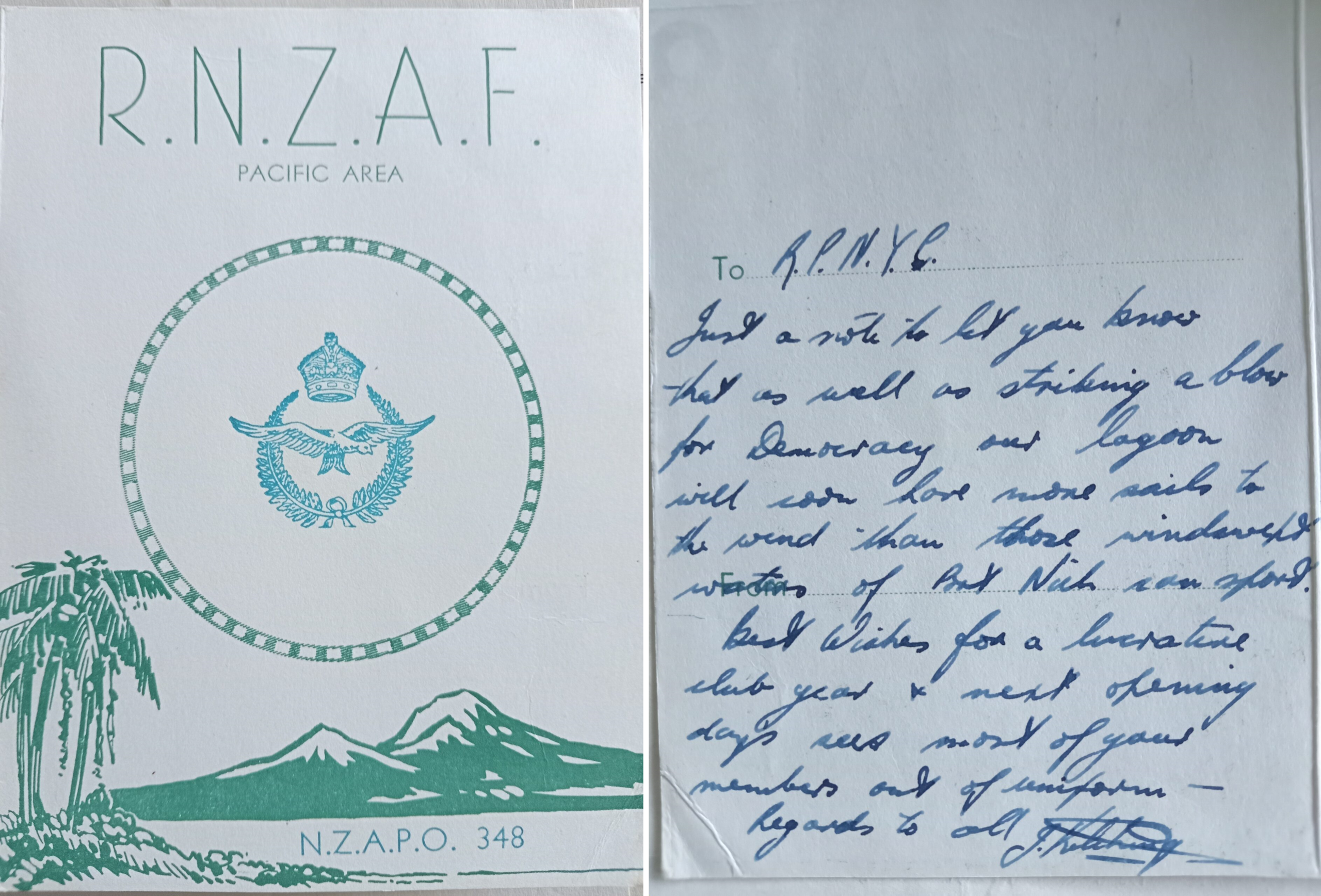 The above quote comes from the diary of Ronald Hermanns, an NZRAF serviceman based on Espritu Santos in 1943 and Guadalcanal in 1944 and ‘45. Among the men who made this yacht club happen were Wellington centreboarder racers Clive Highet, George Fisher, Frank Ballinger, all RPNYC members, and Dick Moult of Evans Bay YMBC, who was a power boat competitor during the 1930s. Others as yet unidentified include the “ATS” whose article is reproduced below, and the man who sent the postcard at the bottom of this article.